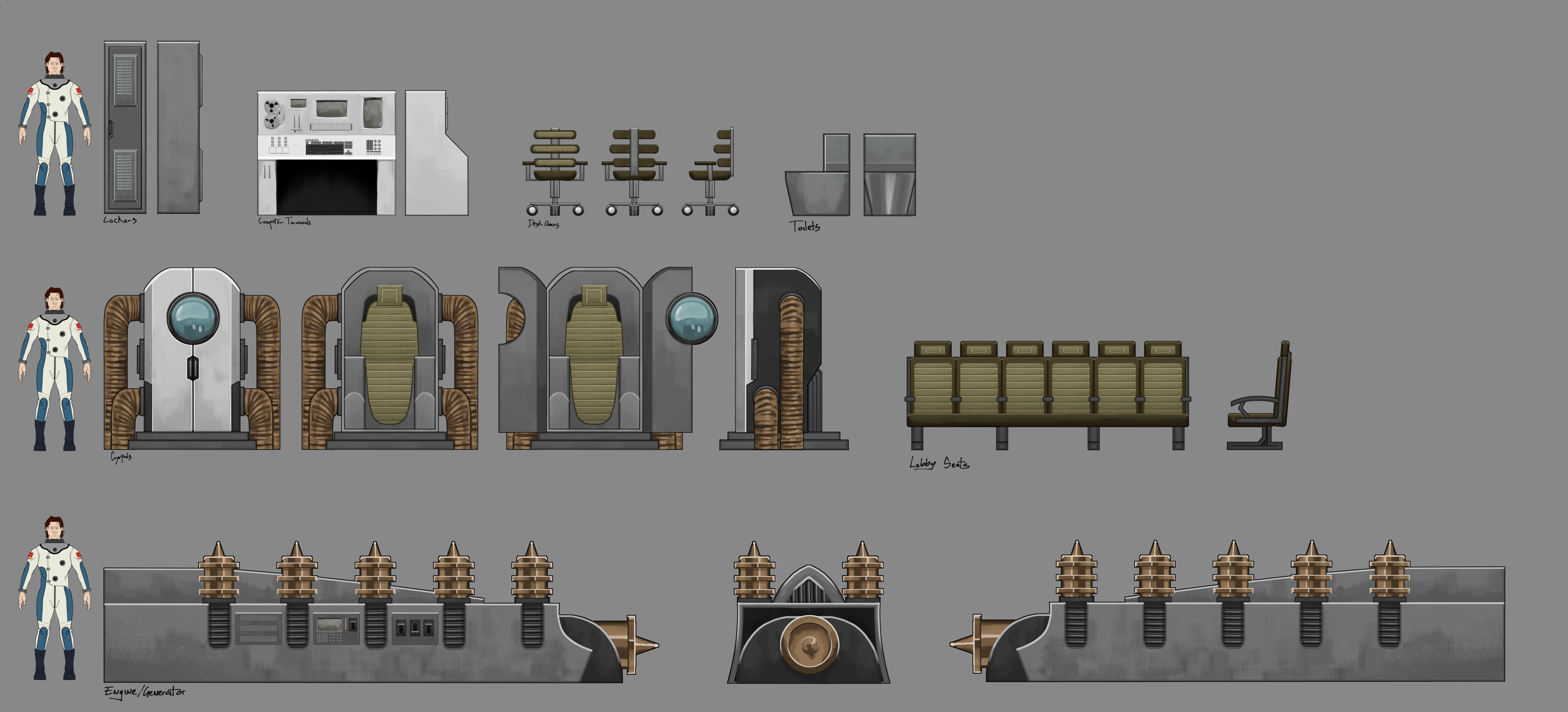 This past week has been a busy week for everyone, with progress being made on all fronts. I've put down the texturing for a little bit to focus on the concept art for the props that will fill our levels. While I am working a little on the slow side with this, I am still making steady progress. My main goal for this coming week is to finish all the props for our first level, and then get stuck into all the props for our second level at the end of this week. Below, you'll see a prop sheet of the current prop concepts I have completed.